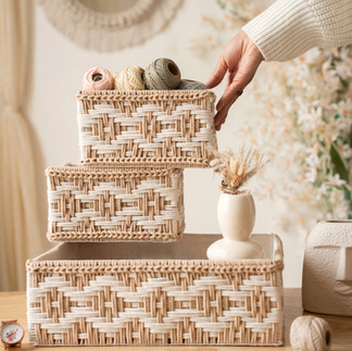 Introducing the Satori Basket - Set of 3, Boheme Duo Basket Set, Wabi Sabi Lid Basket, and more—each trio meticulously woven with eco-conscious materials, blending rustic charm with contemporary aesthetics.